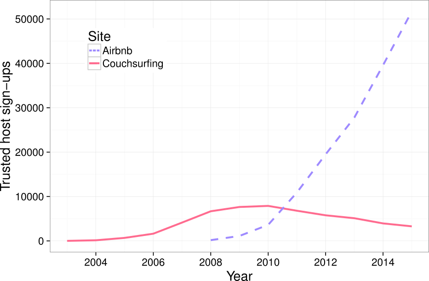 Comparison of yearly sign-ups of trusted hosts on Couchsurfing and Airbnb. Hosts are “trusted” when they have any form of references or verification in Couchsurfing and at least one review in Airbnb.