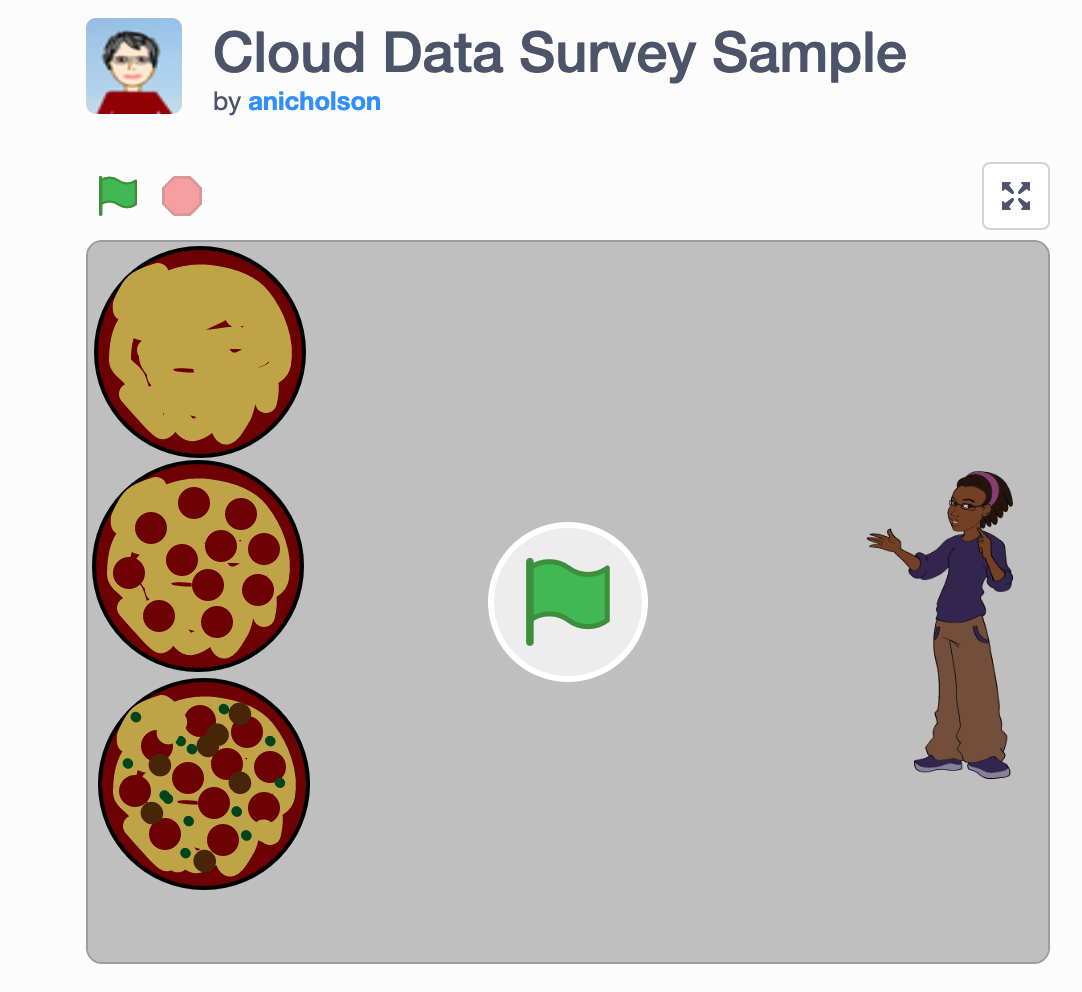Caption: A Scratch project demonstrated during the workshop made with Cloud Data.