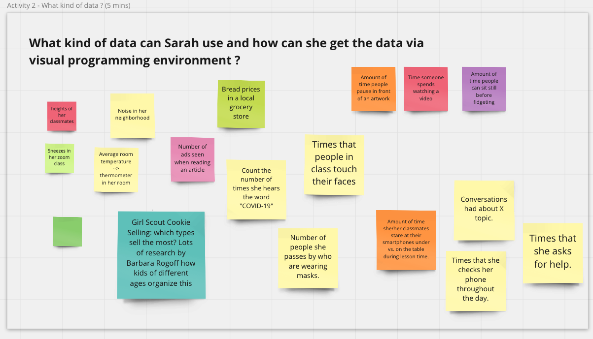 The breakout section about block-based tools started with PhD candidate Stefania Druga demonstrating a program in Scratch and how users could interact with data using the Scratch Cloud Data. We brainstormed about the kind of data students could collect and explore and the kind of visualization, game-based, or other creative interactions youth could create with the help of block-based tools. As a group, we came up with many creative ideas. For example, students can collect and visualize “the newest COVID tweet at the time you touched” a sensor and make “sound effect every time you count a face-touch.”