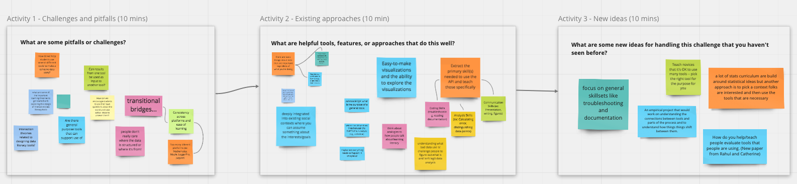 Our workshop took place on July 13th and July 15th as part of the 2021 Connected Learning Summit. Participants came from diverse backgrounds and the group included academic researchers, industry practitioners, K-12 teachers, and librarians. On the first day we focused on exploring existing learning scenarios designed to promote youth data literacies. On the second day we built on big questions raised in the initial session and brainstormed features for future systems. Both workshop sessions were composed of several breakout sessions. We took notes in a shared editor and encouraged participants to add their ideas and comments on sticky notes on collaborative digital white boards and share their definitions and questions around data literacies.