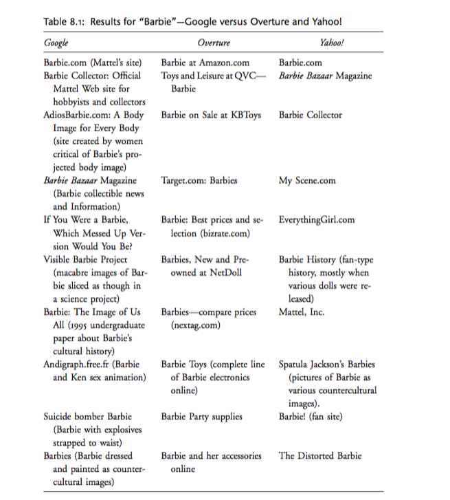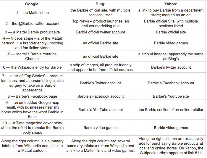 When I follow Benkler’s lead and search for ‘Barbie’ using three different search engines, the results are even more different from 2006. Benkler describes differences in search engine results as revealing different possibilities – via Google, Barbie was portrayed as “a culturally contested figure”, whereas on Overture (a now-defunct shopping-oriented search engine), the searcher encountered “a commodity toy.”