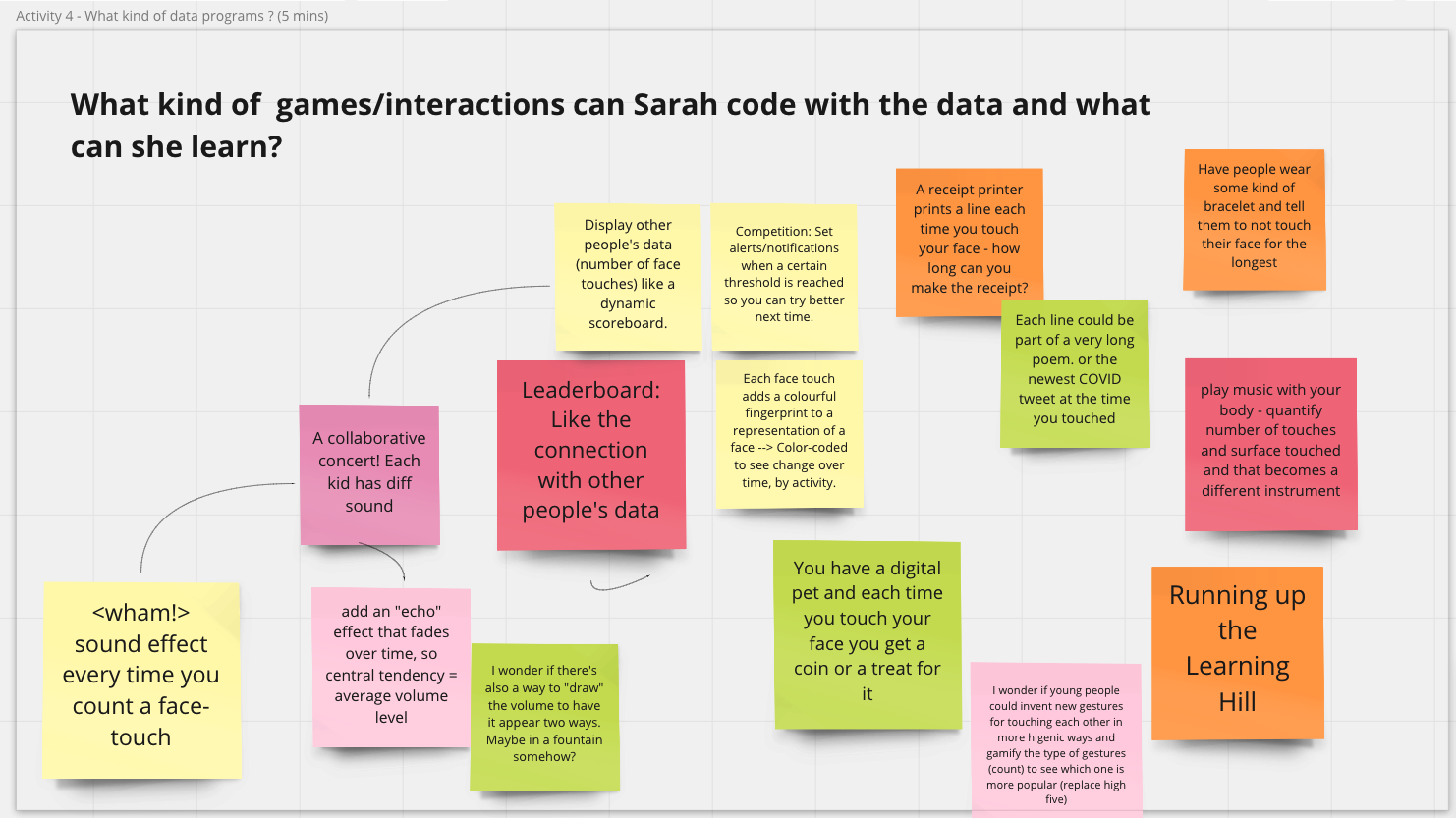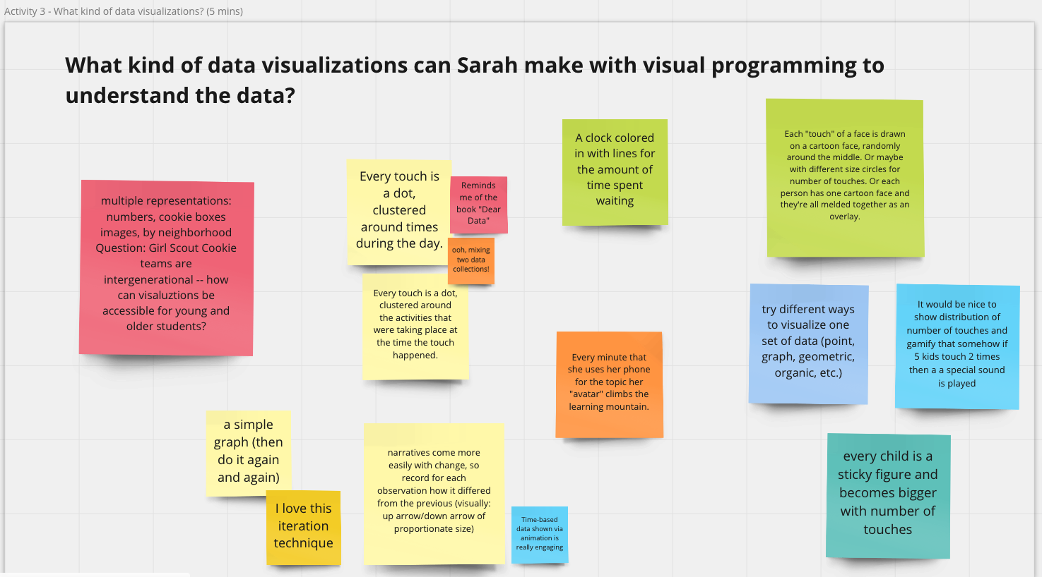 Our group also felt that interaction with data should not be limited to a single digital software. Many scenarios we came up with were centered on personal data collection in physical spaces (e.g., counting the number of times a student touches their own face). This points to a future design direction of how we can connect multiple tools that support interaction in both digital and physical spaces and encourage students to explore questions using different tools.