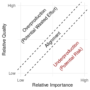 Conceptual diagram showing how our conception of underproduction relates to quality and importance of software.