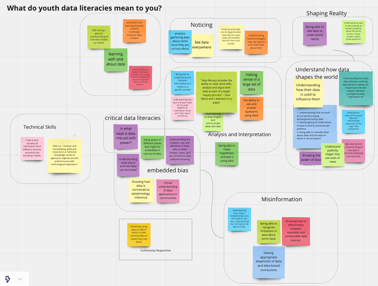 Caption: We opened our sessions by encouraging participants to share and synthesize what youth data literacies meant to them. This affinity diagram is the result.