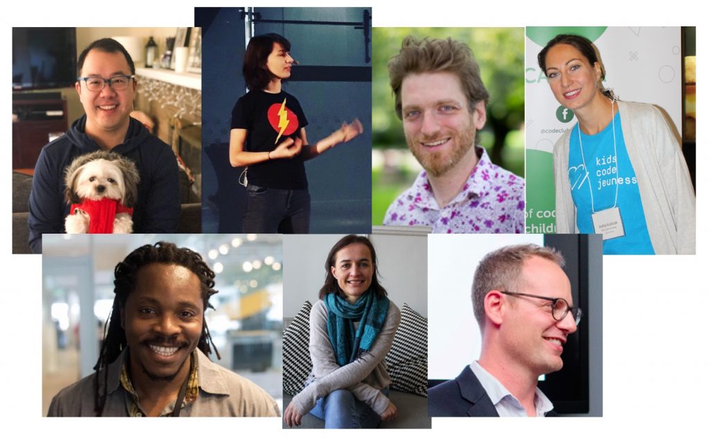 Partners in the AI Literacy Project funded by Jacobs Fellowship (from top left to right): Jason Yip – Assistant Professor iSchool University of Washington, Stefania Druga – Doctoral Student iSchool University of Washington, Benjamin Mako Hill – Assistant Professor Department of Communications University of Washington, Indra Kubicek – CFO at Kids Code Jeunesse, David Moinina Sengeh – Minister Of Basic and Senior Secondary Education at Government of Sierra Leone, Kate Arthur – Founder & CEO at Kids Code Jeunesse, Michael Preston – co-founder CSforALL & Executive Director of Joan Ganz Cooney Center at Sesame Workshop.